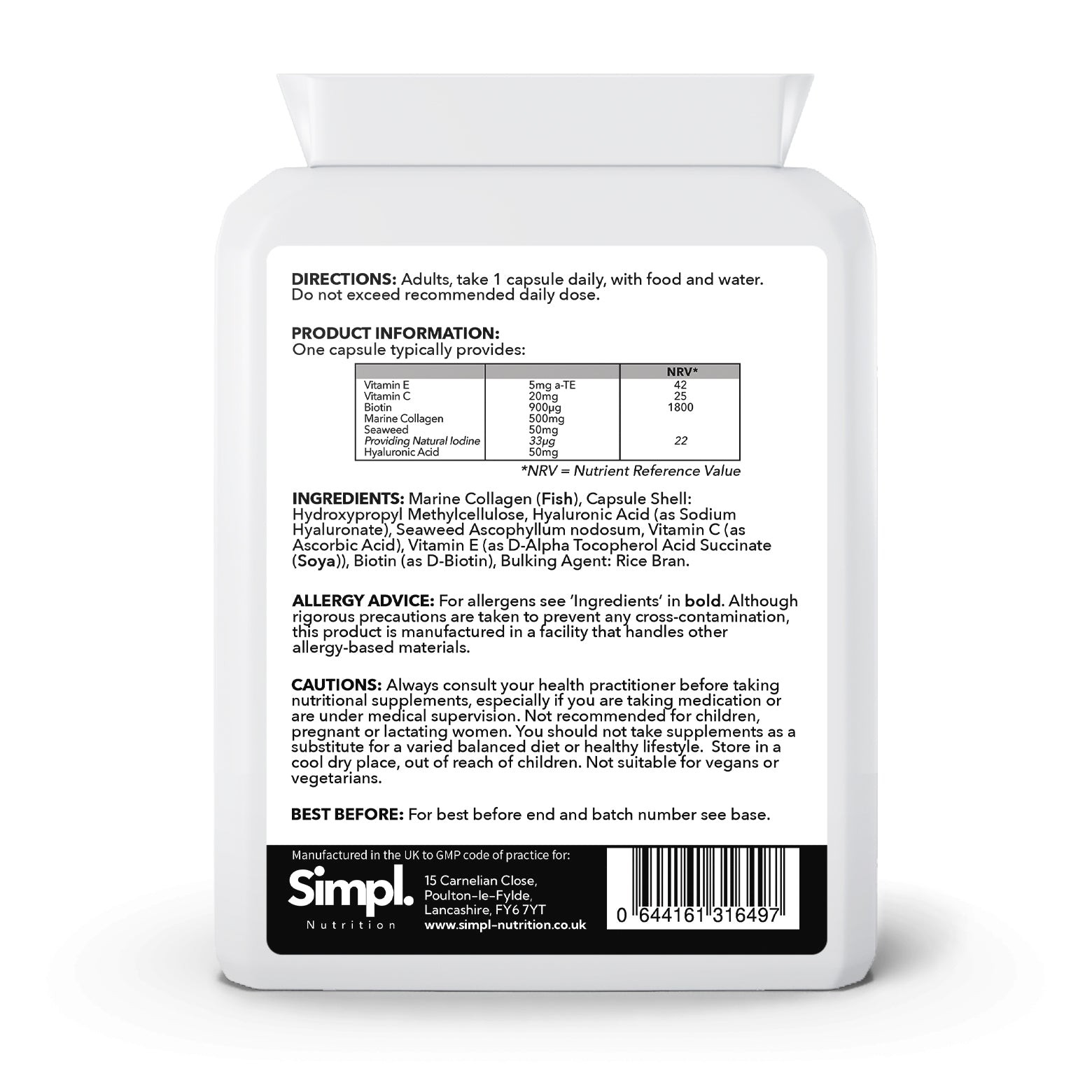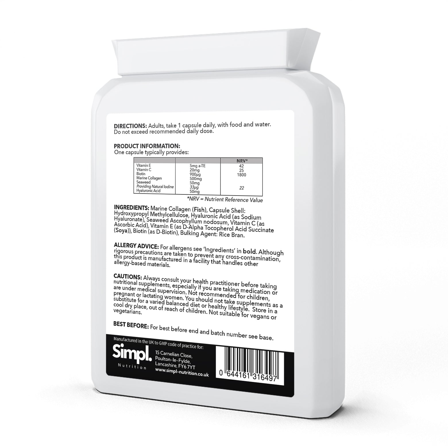 Food Supplement containing Collagen, Hyaluronic Acid, Vitamins & Natural Iodine from Seaweed. Information about some of the ingredient below.